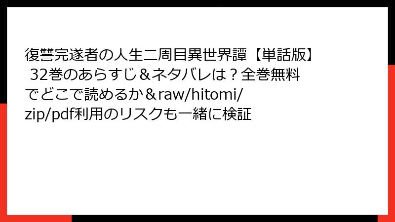 異世界転生漫画の人気作「復讐完遂者の人生二周目異世界譚」の第32話について、徹底的なネタバレ情報をブログ記事形式でお届けします。このエピソードは、主人公の過去と異世界のつながりが深まる重要な転換点です。物語の核心に触れる内容なので、未読の方は閲覧注意。以下で、背景から詳細なイベント、キャラクターの内面までを掘り下げます。