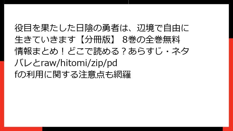 役目を果たした日陰の勇者は、辺境で自由に生きていきます【分冊版】 8巻の全巻無料情報まとめ!どこで読める?あらすじ・ネタバレとraw/hitomi/zip/pdfの利用に関する注意点も網羅