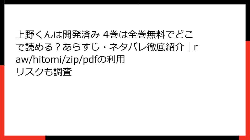 人気漫画「上野くんは開発済み」を、raw/hitomi/zip/pdf/漫画バンクなどの海賊版サイトで無料で読もうとする人は少なくありません。しかし、これらのサイトを利用することは、さまざまな深刻なリスクを伴います。この記事では、海賊版サイトの利用がもたらす法的、セキュリティ、プライバシー、品質、倫理的な問題を詳しく解説します。正規のプラットフォームで楽しむことを強くおすすめしますが、以下でリスクを深掘りしていきましょう。