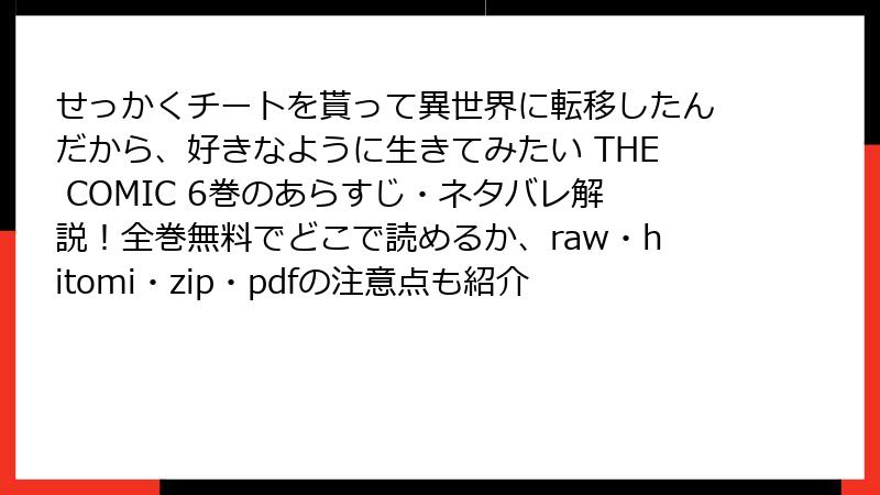 せっかくチートを貰って異世界に転移したんだから、好きなように生きてみたい THE COMIC 6巻のあらすじ・ネタバレ解説!全巻無料でどこで読めるか、raw・hitomi・zip・pdfの注意点も紹介