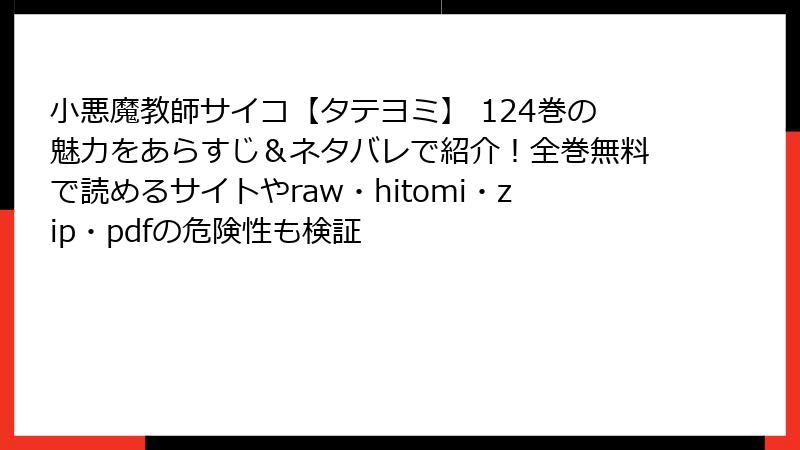 人気のタテヨミ漫画「小悪魔教師サイコ【タテヨミ】」の124巻を、raw、hitomi、zip、pdf、漫画バンクなどの海賊版サイトで無料で読もうと考える人もいるかもしれません。しかし、これらのサイトを利用することは、法的・セキュリティ面で深刻なリスクを伴います。この記事では、そんな海賊版サイトの危険性を詳しく解説します。なぜ正規ルートを選ぶべきかを、具体例を交えながら掘り下げていきましょう。海賊版は一時的な便利さの裏に大きな代償が隠れているのです。