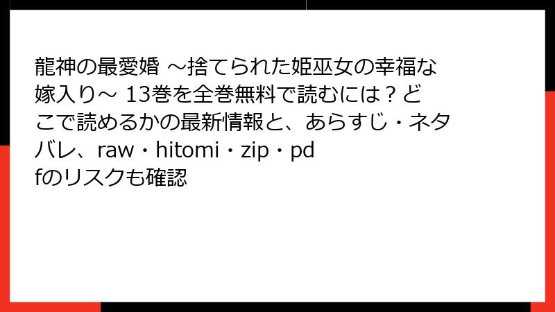 龍神の最愛婚 ~捨てられた姫巫女の幸福な嫁入り~ 13巻を全巻無料で読むには?どこで読めるかの最新情報と、あらすじ・ネタバレ、raw・hitomi・zip・pdfのリスクも確認