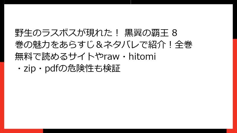 こんにちは、漫画愛好家のブログ主です。今回は『黒翼の覇王』第8巻のネタバレに続き、**海賊版サイト(raw、hitomi、zip、pdf、漫画バンクなど)で読むことの“本当の代償”**を徹底解説します。「無料で読めるならラッキー」と思うかもしれませんが、実は**命取り級のリスク**が潜んでいます。法的トラブルから個人情報流出、さらには作者・業界へのダメージまで、データと事例を交えて赤裸々に暴きます。未読の方も、すでに利用している方も、必読です!