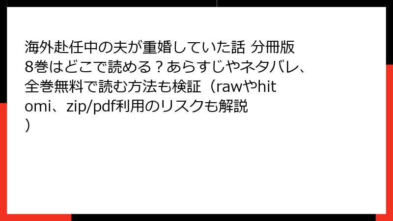 raw、hitomi、zip、pdf、漫画バンクなどの海賊版サイトで「海外赴任中の夫が重婚していた話 分冊版 8巻」を読むのは、法的罰則、セキュリティ被害、倫理的問題を引き起こす危険な行為です。これらのリスクを理解し、正しい選択を。漫画の魅力を長く楽しむためにも、合法的な方法を優先しましょう。