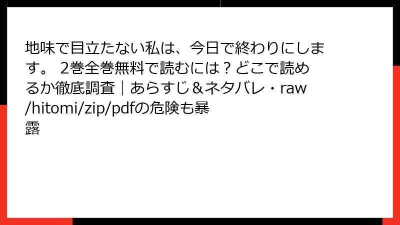 人気漫画「地味で目立たない私は、今日で終わりにします。」を楽しむ方法として、海賊版サイト(raw、hitomi、zip、pdf、漫画バンクなど)が浮上することがありますが、これらを利用する際のリスクは無視できません。この記事では、そんな海賊版サイトの利用に伴うさまざまな危険性を詳しく解説します。法的問題からセキュリティの脅威、倫理的な側面までを掘り下げ、なぜ正規ルートを選ぶべきかを考えます。読み進めながら、自分自身の選択を振り返ってみてください。