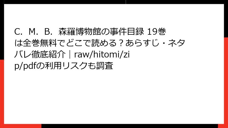 の見出しタグから始めて、ブログ記事形式で出力して。複数の タグを使用して、読み応えがあるように。HTMLで出力。 や などの箇条書きのHTMLタグや、tableタグも使用してOK。ただし、リンクやURLは、絶対に、挿入しない。 この漫画・コミックの、ネタバレ情報を詳しく。単一の の見出しタグから始めて、ブログ記事形式で出力して。複数の タグを使用して、読み応えがあるように。HTMLで出力。 や などの箇条書きのHTMLタグや、tableタグも使用してOK。ただし、リンクやURLは、絶対に、挿入しない。 この漫画・コミックを、raw/hitomi/zip/pdf/漫画バンクなどの海賊版サイトで読むことのリスクを、詳しく。単一の の見出しタグから始めて、ブログ記事形式で出力して。複数の タグを使用して、読み応えがあるように。HTMLで出力。 や などの箇条書きのHTMLタグや、tableタグも使用してOK。ただし、リンクやURLは、絶対に、挿入しない。 この漫画・コミックの、レビュー・口コミ・評判について、詳しく。単一の の見出しタグから始めて、ブログ記事形式で出力して。複数の タグを使用して、読み応えがあるように。HTMLで出力。 や などの箇条書きのHTMLタグや、tableタグも使用してOK。ただし、リンクやURLは、絶対に、挿入しない。 C.M.B. 森羅博物館の事件目録 19巻の電子書籍配信状況
