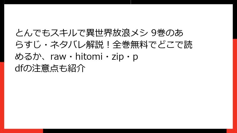 raw/hitomi/zip/pdf/漫画バンクなどの海賊版サイトで『とんでもスキルで異世界放浪メシ』を読むのは、法的・セキュリティ・プライバシー・倫理的な多大なリスクを伴います。一時の無料誘惑に負けず、正規の手段で楽しむことが重要です。これにより、自分自身を守りながら、作者を支援する健全なファン活動が可能です。リスクを理解し、安全第一の選択を心がけましょう。