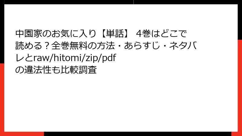人気漫画「中園家のお気に入り【単話】4巻」を、raw、hitomi、zip、pdf、漫画バンクなどの海賊版サイトで無料で読もうとする人は少なくありません。しかし、これらのサイトを利用することは、法的・セキュリティ面で深刻なリスクを伴います。この記事では、そんな海賊版サイトの利用がもたらすさまざまな危険を詳しく掘り下げます。決して安易にアクセスせず、正規のルートで楽しむことをおすすめします。