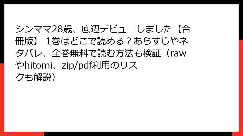 人気漫画「シンママ28歳、底辺デビューしました【合冊版】 1巻」を、raw、hitomi、zip、pdf、漫画バンクなどの海賊版サイトで無料で読もうとする行為は、魅力的に見えるかもしれません。しかし、これらのサイトは深刻なリスクを伴います。この記事では、法的・セキュリティ・プライバシー・倫理的観点からリスクを詳しく解説します。海賊版利用の甘い誘惑に負けず、安全で正規の方法を選ぶ重要性を理解してください。