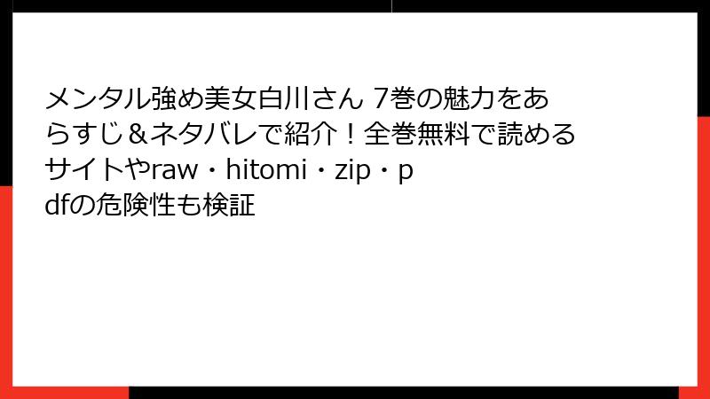 raw、hitomi、zip、pdf、漫画バンクなどの海賊版サイトで「メンタル強め美女白川さん 7巻」を読むのは、法的・セキュリティ・倫理的な観点から極めて危険です。代わりに、正規の電子書籍サービスを利用すれば、安全に高品質な作品を楽しめます。あなたのデバイスと心を守るため、海賊版は絶対に避けましょう。この記事が、少しでも参考になれば幸いです。