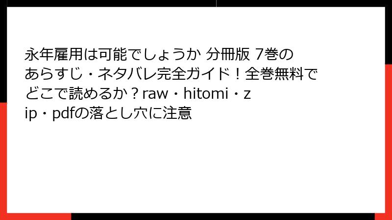 以上のように、海賊版サイトで『永年雇用は可能でしょうか』分冊版7巻を読むリスクは多岐にわたり、法的・セキュリティ・品質・倫理的な問題が絡み合っています。これらを避けるため、正規の電子書籍サービスや書店を利用することを強くおすすめします。正規版なら高品質で安全、作者を支援できるメリットがあります。海賊版の誘惑に負けず、責任ある読書を楽しんでください。