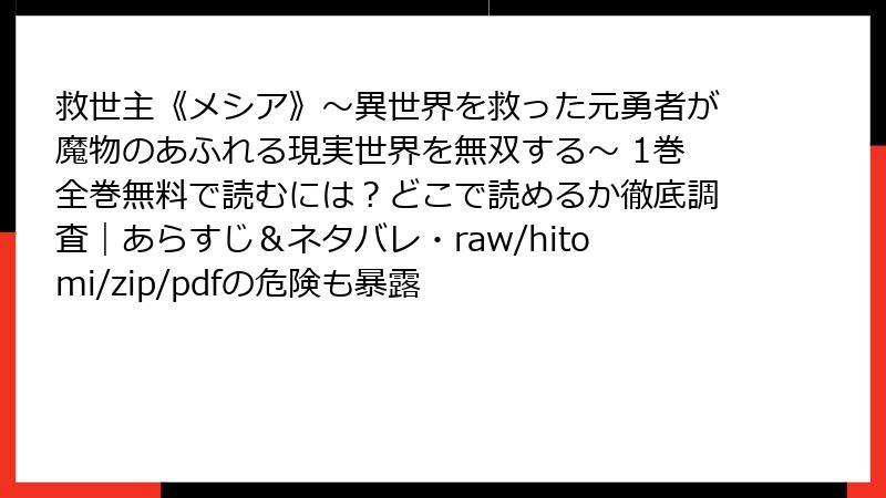 - 救世主《メシア》~異世界を救った元勇者が魔物のあふれる現実世界を無双する~ 1巻を海賊版サイトで読むリスク