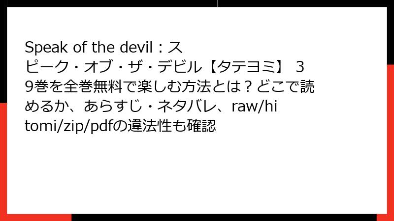 人気BLマンガ「Speak of the Devil:スピーク・オブ・ザ・デビル【タテヨミ】」を、raw/hitomi/zip/pdf/漫画バンクなどの海賊版サイトで読むのは手軽に思えるかもしれませんが、さまざまなリスクが伴います。この記事では、そうした海賊版サイト利用の危険性をブログ風に詳しく掘り下げます。法的問題からセキュリティ面まで、読み応えのある内容でお届けします。海賊版はクリエイターを傷つけるだけでなく、自分自身にも害を及ぼす可能性が高いので、注意が必要です。