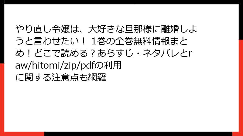 この記事では、人気漫画「やり直し令嬢は、大好きな旦那様に離婚しようと言わせたい!」の1巻のあらすじを詳しく解説します。ファンタジー要素を交えたラブコメディで、タイムスリップと不器用な恋愛模様が魅力です。ネタバレを含みますので、ご注意ください。