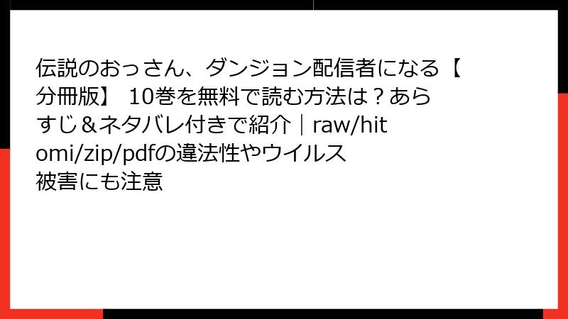 raw、hitomi、zip、pdf、漫画バンクなどの海賊版サイトで『伝説のおっさん、ダンジョン配信者になる【分冊版】10巻』を読むのは、法的・セキュリティ・倫理的な観点から極めて危険です。一瞬の無料体験が、長期的なトラブルを引き起こす可能性を十分に認識してください。リスクを避けるため、常に正規ルートを選択しましょう。