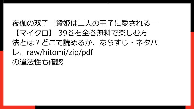 人気の王宮ファンタジーラブストーリー、『夜伽の双子―贄姫は二人の王子に愛される―【マイクロ】』の39巻について、詳しく掘り下げてみましょう。この巻では、ヒロインのヒルマが双子の王子たちとの複雑な関係の中で、新たな秘密に直面します。物語の緊張感が高まり、甘く切ない展開が続きます。以下で、ストーリーのポイントを整理しながら解説していきます。