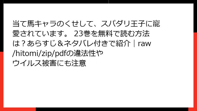 「当て馬キャラのくせして、スパダリ王子に寵愛されています。」をraw、hitomi、zip、pdf、漫画バンクなどの海賊版サイトで読むのは、法的・セキュリティ・倫理的な多大なリスクを伴います。逮捕の恐れ、ウイルス感染、業界衰退など、デメリットがメリットを上回ります。ファンとして作品を大切にするためにも、正規手段を選びましょう。安全第一で楽しむことが、真のファンシップです。