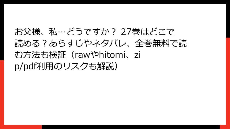 この人気の青年マンガ「お父様、私…どうですか?」の27巻は、多くの電子書籍サービスで配信されています。以下では、コミックシーモア、ブックライブ、まんが王国、ebookjapan、Renta!、めちゃコミック、ピッコマ、LINEマンガなどの主なサービスについて、利用可能性や特徴を詳しく解説します。各サービスで通常版、タテヨミ版、特別修正版などが提供されており、無料試し読みやポイント購入が可能です。