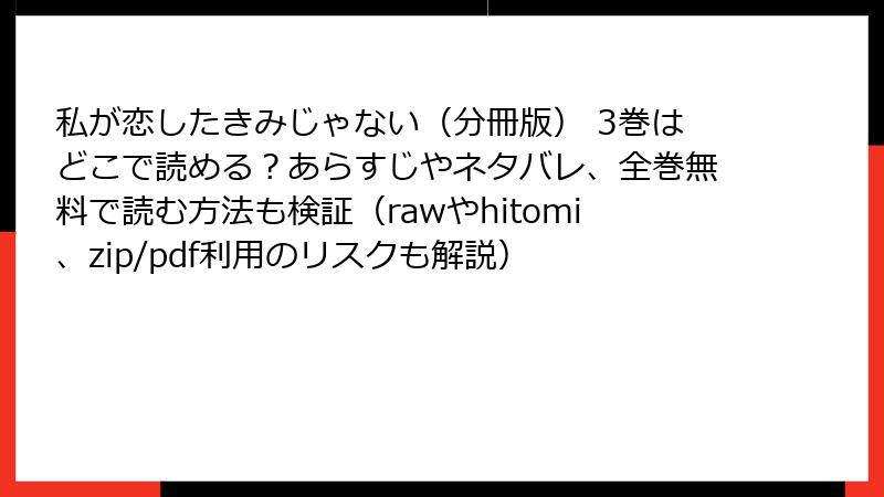 まとめると、海賊版サイトで「私が恋したきみじゃない」を読むのは、法的・セキュリティ・品質・倫理的多角的なリスクを伴います。これらを避けるため、正規の電子書籍サービスを利用し、作者を支援しましょう。安全でクリーンな楽しみ方が一番です。