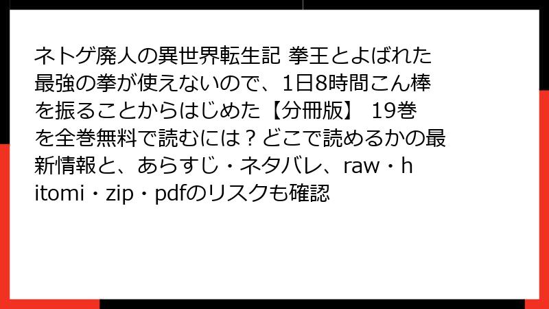 人気コミック「ネトゲ廃人の異世界転生記 拳王とよばれた最強の拳が使えないので、1日8時間こん棒を振ることからはじめた」の分冊版19巻を、raw、hitomi、zip、pdf、漫画バンクなどの海賊版サイトで読むのは魅力的かもしれませんが、さまざまなリスクが伴います。この記事では、そうした違法サイト利用の危険性を詳しく解説します。法的問題からセキュリティの脅威まで、読み応えのある形でまとめました。海賊版利用を検討している方は、ぜひ参考にしてください。