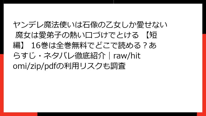 人気のファンタジーロマンス漫画「ヤンデレ魔法使いは石像の乙女しか愛せない 魔女は愛弟子の熱い口づけでとける 【短編】 16巻」を、raw、hitomi、zip、pdf、漫画バンクなどの海賊版サイトで読むのは一見手軽ですが、さまざまなリスクが伴います。この記事では、法的側面からセキュリティ、倫理的問題までを詳しく解説します。公式ルートで楽しむことを強くおすすめしますが、ここでは海賊版の危険性を深掘りして、読者の皆さんが賢い選択をするための情報を提供します。
