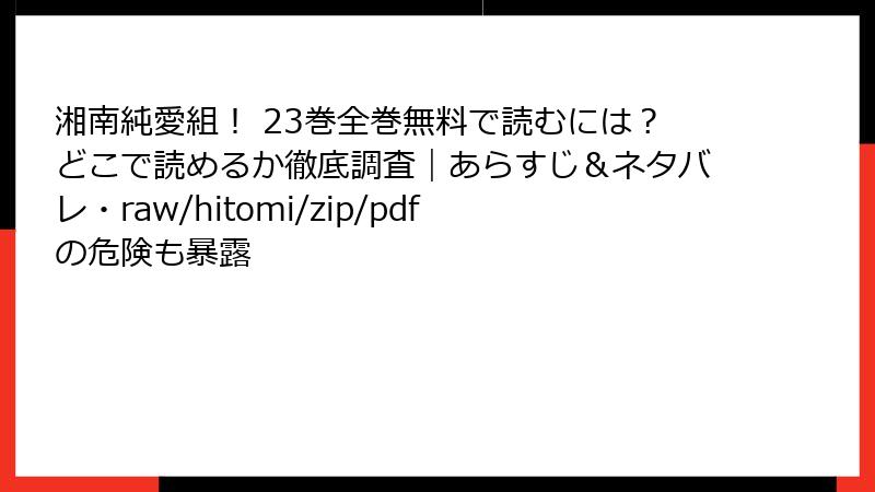 人気漫画『湘南純愛組!』の23巻を、raw、hitomi、zip、pdf、漫画バンクなどの海賊版サイトで読むことは、一見手軽に見えますが、深刻なリスクを伴います。この記事では、法的問題からセキュリティ脅威、倫理的側面までを詳しく解説します。海賊版利用はクリエイターの権利を侵害し、自身にも害を及ぼす可能性が高いため、公式ルートをおすすめします。以下で各リスクを深掘りします。