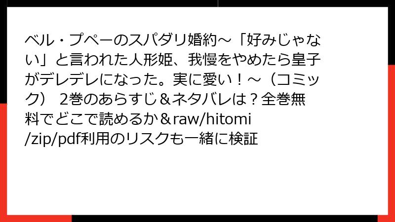 人気のロマンスファンタジーマンガ「ベル・プペーのスパダリ婚約~「好みじゃない」と言われた人形姫、我慢をやめたら皇子がデレデレになった。実に愛い!~(コミック)」の2巻を、raw、hitomi、zip、pdf、漫画バンクなどの海賊版サイトで読むのは魅力的かもしれませんが、実は多大なリスクを伴います。この記事では、そんな海賊版サイト利用の危険性を法的、セキュリティ、倫理的な観点から詳しく解説します。海賊版は一見無料ですが、代償が大きいことを理解しましょう。未然に防ぐための知識としてお読みください。