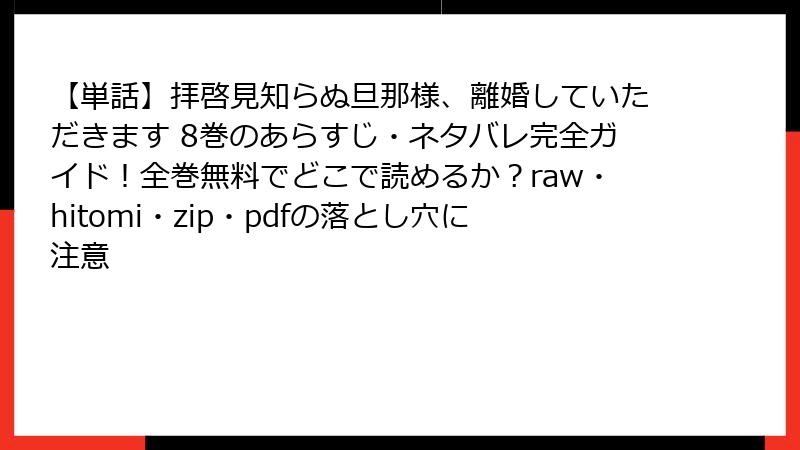 『拝啓見知らぬ旦那様、離婚していただきます』をraw/hitomi/zip/pdf/漫画バンクなどで読むリスクは、法的罰則、セキュリティ被害、プライバシー漏洩、品質低下など多岐にわたります。これらを避けるため、正規の電子書籍サービスや書店を利用しましょう。無料の魅力に負けず、長期的に作品を支える選択が、ファンとしての責任です。安全第一で、素晴らしい物語を心ゆくまで堪能してください。