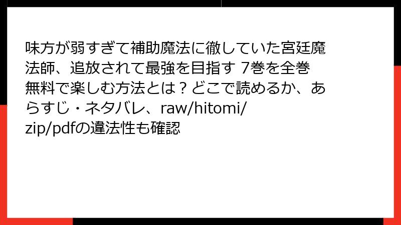 味方が弱すぎて補助魔法に徹していた宮廷魔法師、追放されて最強を目指す 7巻を全巻無料で楽しむ方法とは?どこで読めるか、あらすじ・ネタバレ、raw/hitomi/zip/pdfの違法性も確認
