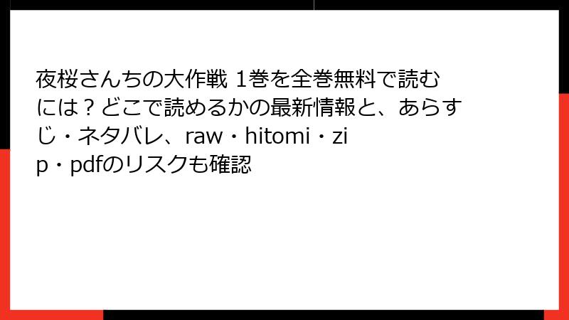 『夜桜さんちの大作戦』1巻をraw、hitomi、zip、pdf、漫画バンクなどの海賊版サイトで読むのは、法的罰則、セキュリティ脅威、品質低下、倫理的問題という多角的なリスクを伴います。一時的な無料の魅力に惑わされず、安全で合法的な方法を選ぶことが賢明です。漫画の未来を守るためにも、海賊版は避け、クリエイターを支援する姿勢を心がけましょう。