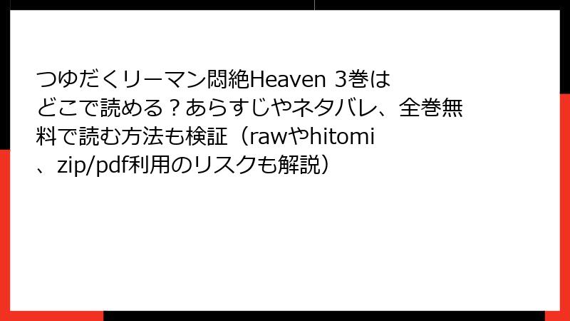 人気のBLコミック「つゆだくリーマン悶絶Heaven 3巻」を、raw/hitomi/zip/pdf/漫画バンクなどの海賊版サイトで無料で読もうとする人は少なくありません。しかし、これらのサイトを利用することは、さまざまな深刻なリスクを伴います。この記事では、海賊版サイトの利用がもたらす法的、セキュリティ、プライバシー、品質、倫理的、経済的な側面からリスクを詳しく解説します。海賊版は一見お得に見えますが、長期的に見て損失が大きいことを理解しましょう。