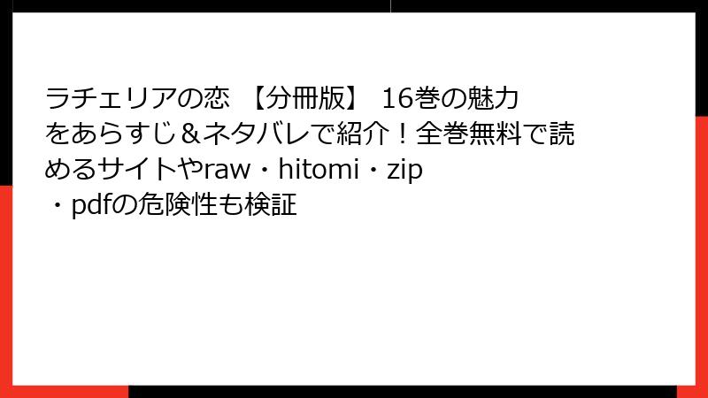 人気のファンタジー恋愛漫画「ラチェリアの恋 【分冊版】 16巻」を、raw、hitomi、zip、pdf、漫画バンクなどの海賊版サイトで無料で読もうと考える人もいるかもしれません。しかし、これらのサイトを利用することは、さまざまな深刻なリスクを伴います。この記事では、そのリスクを法的、セキュリティ、プライバシー、業界への影響などの観点から詳しく解説します。海賊版サイトの利用は絶対に避け、正規の手段で楽しむことを強くおすすめします。