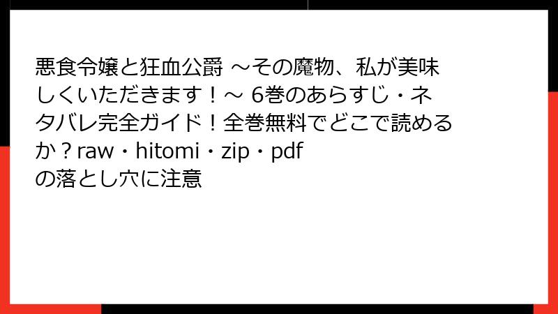 raw/hitomi/zip/pdf/漫画バンクなどの海賊版サイトは、一見無料で便利に見えますが、法的罰則・ウイルス感染・品質低下・作者ダメージの4大リスクで、結局損失の方が大きいのです。特にこの『悪食令嬢と狂血公爵』は、魔物食のワクワクと公爵の優しいイチャイチャが魅力の作品。公式電子書籍や紙版で購入すれば、綺麗な画質・正しいストーリー・作者への直接応援がすべて手に入ります。6巻の天狼大騒動も、安心して心ゆくまで味わいましょう! 賢いファンとして、正しい選択を心からおすすめします。