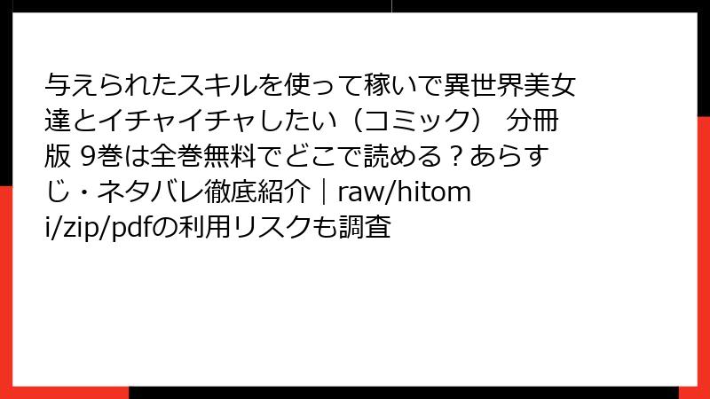 - 『与えられたスキルを使って稼いで異世界美女達とイチャイチャしたい(コミック) 分冊版 9巻』をraw/hitomi/zip/pdf/漫画バンクなどの海賊版サイトで読むリスクを徹底解説