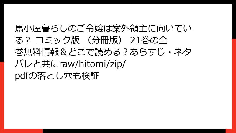 馬小屋暮らしのご令嬢は案外領主に向いている? コミック版 (分冊版) 21巻の全巻無料情報&どこで読める?あらすじ・ネタバレと共にraw/hitomi/zip/pdfの落とし穴も検証