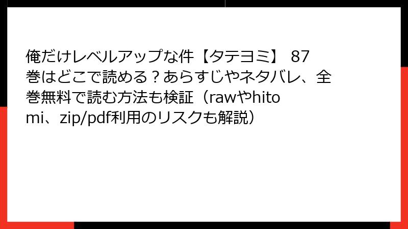 以上のように、raw/hitomi/zip/pdf/漫画バンクなどで「俺だけレベルアップな件【タテヨミ】」を読む行為は、法的罰則、セキュリティ被害、作品劣化、作者への打撃、プライバシー侵害という五重苦を抱えています。1回の「無料読み」が、数年後に数万円の損害や後悔を生む可能性は極めて高いのです。公式プラットフォームを選べば、高品質な縦読み体験を安全に楽しめ、作者を直接応援できるメリットが得られます。海賊版の甘い誘惑に負けず、長期的にファンとして作品を支える選択をぜひおすすめします。この記事が、あなたの賢い読書ライフのきっかけになれば幸いです!
