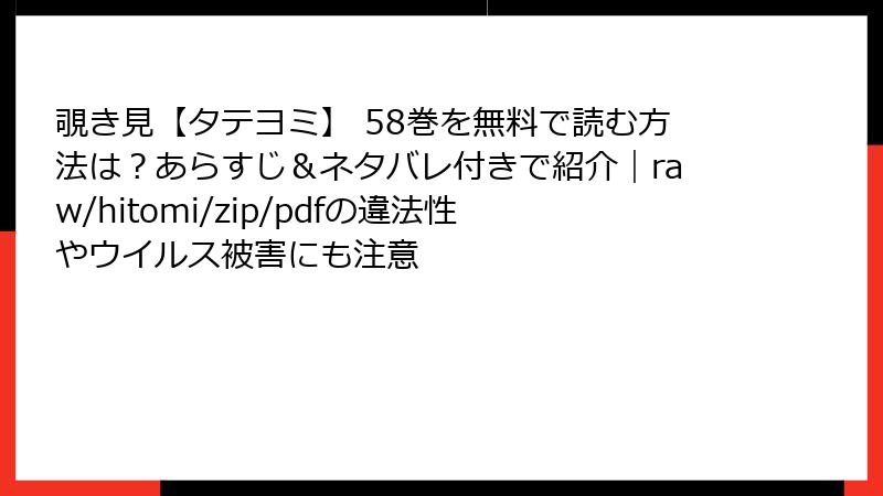 海賊版のrawやスキャン版は、画質が粗く、ページ抜け・翻訳ミスが日常茶飯事。『覗き見【タテヨミ】』58巻の繊細な心理描写やタテヨミ特有の縦スクロールレイアウトが崩壊し、没入感ゼロ。広告のポップアップで毎回中断され、結局正規版を買い直す羽目になる人も多数です。