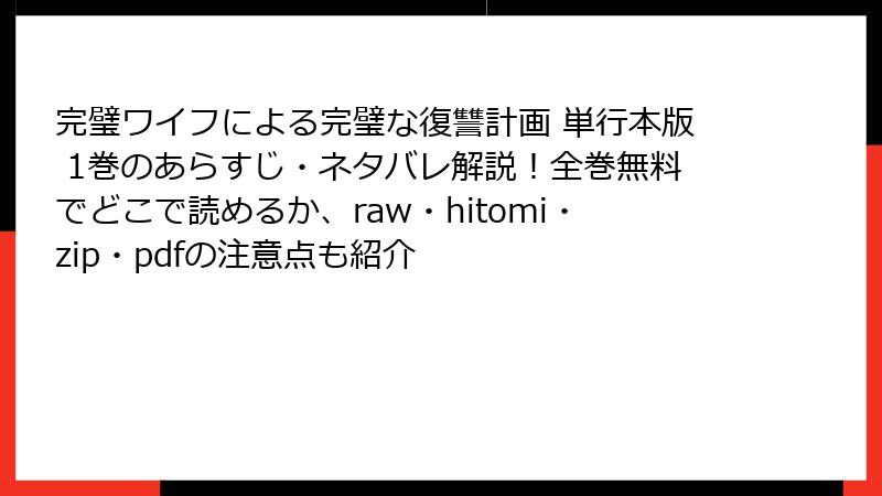 こんにちは、漫画の「正規ルート推奨」ブロガーです。今回は完璧ワイフによる完璧な復讐計画を例に、海賊版サイト(raw、hitomi、zip、pdf、漫画バンクなど)で読むことの具体的なリスクを徹底解剖。成美の復讐計画のように「完璧に見える選択」が、実はあなたのスマホ・PC・財布・信用を地獄に落とす罠であることを、データと事例で証明します。ネタバレなしで、1巻の魅力を守りながらお届けします!