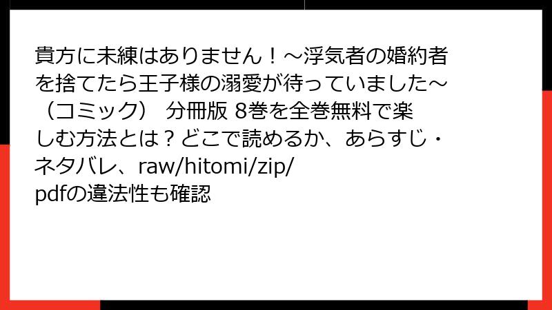 - 『貴方に未練はありません!~浮気者の婚約者を捨てたら王子様の溺愛が待っていました~(コミック) 分冊版 8巻』をraw/hitomi/zip/pdf/漫画バンクなどの海賊版サイトで読むリスクを徹底解説