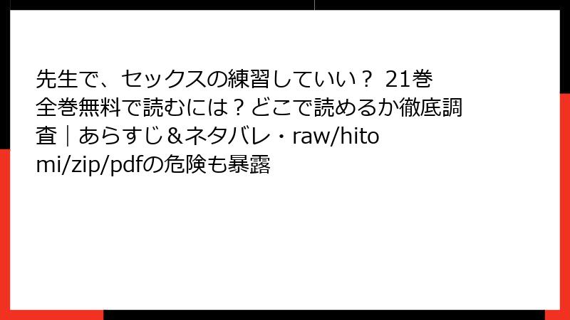 こんにちは! 大人気BLコミック『先生で、セックスの練習していい?』の21巻を含むシリーズを、正規ルート以外で楽しみたいと思う気持ちはわかりますが、海賊版サイト(raw配信、hitomi系画像ビューア、zip/pdf直接ダウンロード、漫画バンクなどの違法配布プラットフォーム)を利用することのリスクは想像以上に深刻です。今日は法的・セキュリティ・品質・倫理的な観点から、具体的に詳しく解説します。未成年キャラクターが登場する作品だからこそ、余計に注意が必要な点も含めて、ブログ形式でしっかりまとめました。安全第一で読書を楽しむための参考にしてくださいね。