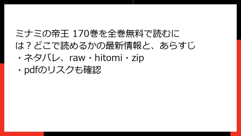 人気長寿コミック『ミナミの帝王』170巻を、raw/hitomi/zip/pdf/漫画バンクなどの海賊版サイトで読もうとする行為は、一見「無料で簡単に」と思われがちですが、実は想像をはるかに超えるリスクが潜んでいます。違法アップロード・ダウンロードは著作権侵害であり、法的・セキュリティ・倫理的な面で深刻な被害を招く可能性が高いのです。この記事では、170巻のような最新巻を対象に、具体的なリスクを多角的に解説。単なる「違法だからやめよう」ではなく、読者自身が被る実害を中心に詳しくお伝えします。