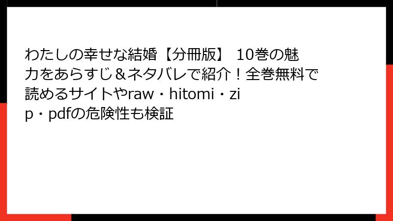 和風純愛ファンタジーの人気作『わたしの幸せな結婚』。美世と清霞の心温まる物語に魅了されるファンは多いですが、分冊版や単行本をraw、hitomi、zip、pdf、漫画バンクなどの海賊版サイトで無料閲覧・ダウンロードしようとする行為は、非常に危険です。2021年の著作権法改正以降、日本では漫画を含むすべての著作物の違法ダウンロードが明確に違法化され、刑事罰の対象となっています。さらに、サイト特有のマルウェアやプライバシー侵害のリスクが伴い、読書どころか日常生活に深刻な被害を及ぼす可能性があります。この記事では、法的リスクからセキュリティリスク、倫理的影響まで、2026年現在の最新事情に基づいて詳しく解説します。後悔しないために、ぜひ最後までお読みください。