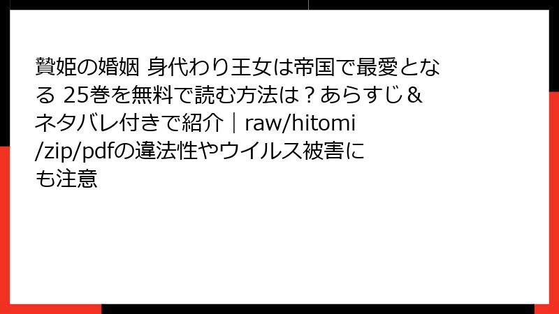 こんにちは、マンガ愛好家の皆さん! 人気ファンタジーロマンス『贄姫の婚姻 身代わり王女は帝国で最愛となる』25巻のネタバレにハマったあなた、続きが気になって仕方ないですよね。でも、rawやhitomi、zip、pdf、漫画バンクなどの海賊版サイトで「無料で読めちゃう!」と飛びつくのは大間違い。こうした違法サイトは、魅力的な表向きの裏に、深刻なリスクが山積みです。この記事では、法的・セキュリティ・経済的・倫理的な側面から、詳しく掘り下げてお伝えします。読了後には、正規ルートで楽しむ重要性がきっと実感できるはず。ネタバレ注意の続きを安全に追いかけるための参考にどうぞ!
