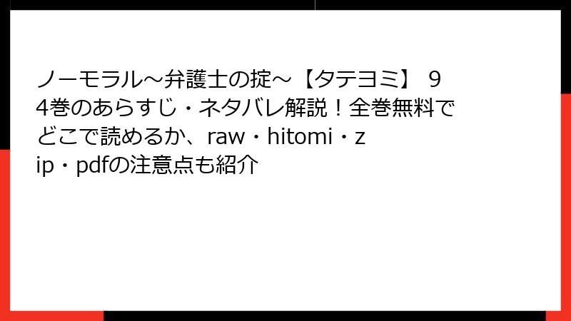 『ノーモラル~弁護士の掟~【タテヨミ】』のような人気BLタテヨミ作品を、公式ルート以外で楽しみたいと思う気持ちはわかります。しかし、raw、hitomi、zip、pdf、漫画バンクなどの海賊版サイトを利用することには、想像以上に深刻なリスクが伴います。この記事では、法的問題からセキュリティ脅威、作品品質の低下、倫理的ダメージまで、94巻を含む全巻に共通する危険性を詳しく解説します。未読の方も、すでに利用を検討中の方も、冷静にリスクを把握して判断してください。