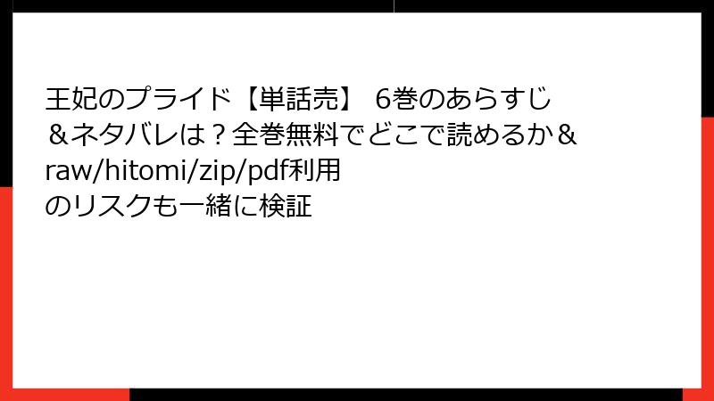 人気の政略結婚ラブファンタジー『王妃のプライド【単話売】』を、raw配信サイト、hitomiのような画像共有サイト、zipやpdf形式の違法アップロード、漫画バンクなどの海賊版プラットフォームで読もうとする人が後を絶ちません。しかし、これらの違法手段は一見「無料で簡単に読める」ように見えますが、実は深刻なリスクを伴います。この記事では、法的・セキュリティ・倫理的な観点から、6巻を含む全巻を海賊版で読む危険性を詳しく解説します。ティルダ王妃のプライドを守るように、あなた自身の安全と未来を守るために、ぜひ最後までお読みください。