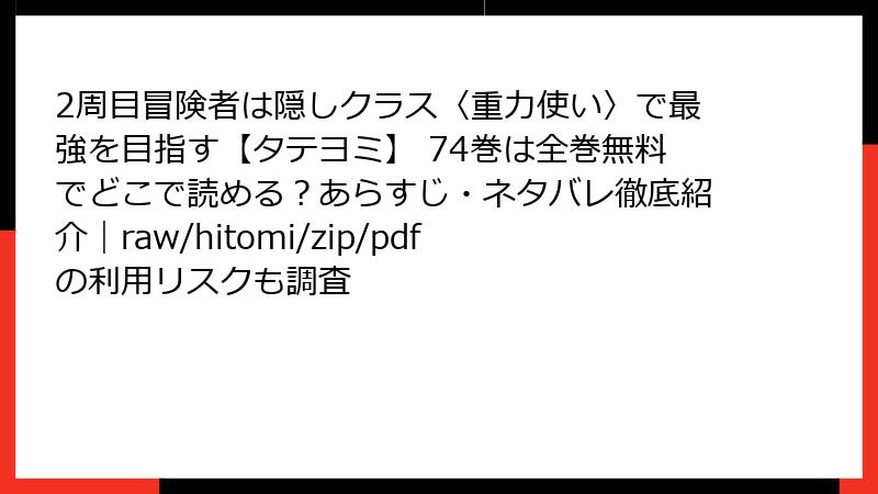 人気のタテヨミ作品『2周目冒険者は隠しクラス〈重力使い〉で最強を目指す【タテヨミ】』74巻を、rawやhitomi、zip、pdf、漫画バンクといった海賊版サイトで読もうと考えている方へ。本記事では、法的・セキュリティ・品質・倫理面など、複数の観点からリスクを詳しく解説します。無料で読める魅力に惹かれる気持ちはわかりますが、思わぬ代償を払う可能性が高いことを知っておきましょう。公式ルートでの購入・読書を強くおすすめします。