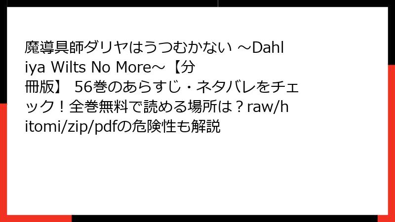 raw/hitomi/zip/pdf/漫画バンクなどの海賊版サイトで『魔導具師ダリヤはうつむかない ~Dahliya Wilts No More~【分冊版】 56巻』を読むのは、法的・セキュリティ・品質・倫理のすべてにおいて大きな代償を伴います。ダリヤが「うつむかない」姿勢で困難を乗り越えるように、私たち読者も正しい選択をすべきです。