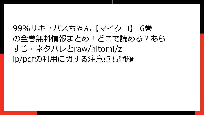 こんにちは、漫画ファンの皆さん! ブログ「マンガ安全読書ラボ」へようこそ。今日のテーマは、誰もが一度は気になってしまう「無料で全巻読める!」という甘い誘惑の裏側。raw、hitomi、zip/pdf、漫画バンクなどの海賊版サイトで『99%サキュバスちゃん【マイクロ】』のような人気作品を読むことのリスクを、2025年現在の最新情報に基づいて深掘りします。一見便利に見えるこれらのサイトですが、法的罰則からウイルス感染、個人情報漏洩まで、想像以上の危険が潜んでいます。ブログ形式で読みやすくまとめましたので、ネタバレなしでリスクだけにフォーカス。無料の代償が大きすぎることを知って、正規ルートで安全に楽しむための参考にしてください。注意:この記事は情報提供を目的としており、違法行為を推奨するものではありません。