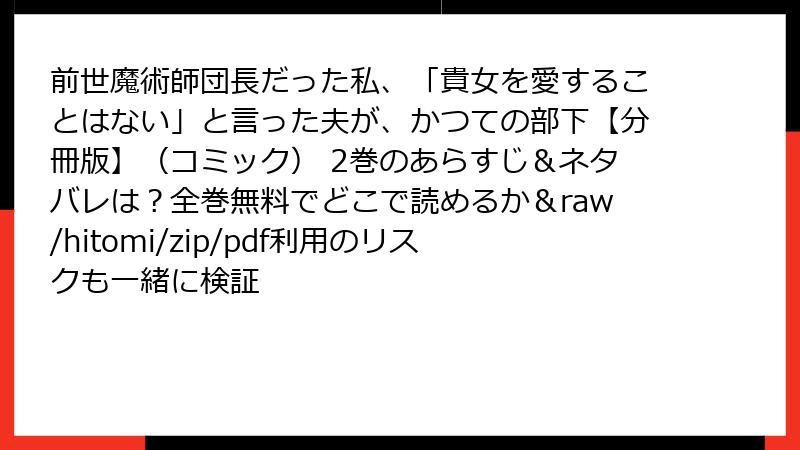 こんにちは、ファンタジー漫画好きの皆さん! 今日は、転生ものとロマンスが絡み合う魅力的な作品、『前世魔術師団長だった私、「貴女を愛することはない」と言った夫が、かつての部下【分冊版】(コミック)』の2巻について詳しくお届けします。このシリーズは、元魔術師団長の女性が前世の部下と再会し、複雑な恋模様を繰り広げるストーリー。1巻で始まった「白い結婚」の関係が、2巻ではさらに甘酸っぱく進展していきます。初恋こじらせ青年と元気いっぱいの転生ヒロインのすれ違いがたまらないんですよね。さっそく、あらすじを深掘りしていきましょう!