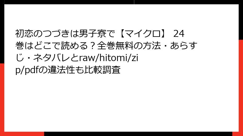 こんにちは、漫画ファンの皆さん! ブログ「マンガ安全読書ラボ」へようこそ。今日のテーマは、誰もが一度は気になってしまう「無料で最新巻読みたい!」という誘惑の裏側。七海月先生の『初恋のつづきは男子寮で【マイクロ】』のような心温まる作品を、raw、hitomi、zip、pdf、漫画バンクなどの海賊版サイトで読むことのリスクについて、ガッツリ深掘りします。2025年現在、これらのサイトは一見便利に見えますが、法的罰則からウイルス感染、個人情報漏洩まで、想像以上の落とし穴が満載。利用者の被害事例が急増中で、軽い気持ちでアクセスすると、後悔の連続ですよ。この記事では、複数のセクションでリスクを分類し、テーブルやリストで読みやすくまとめました。ネタバレなしでリスクだけにフォーカス! 安全に漫画を楽しむための警鐘として、ぜひ最後までお読みください。結論から言うと、絶対に避けて正規ルートを選びましょう!